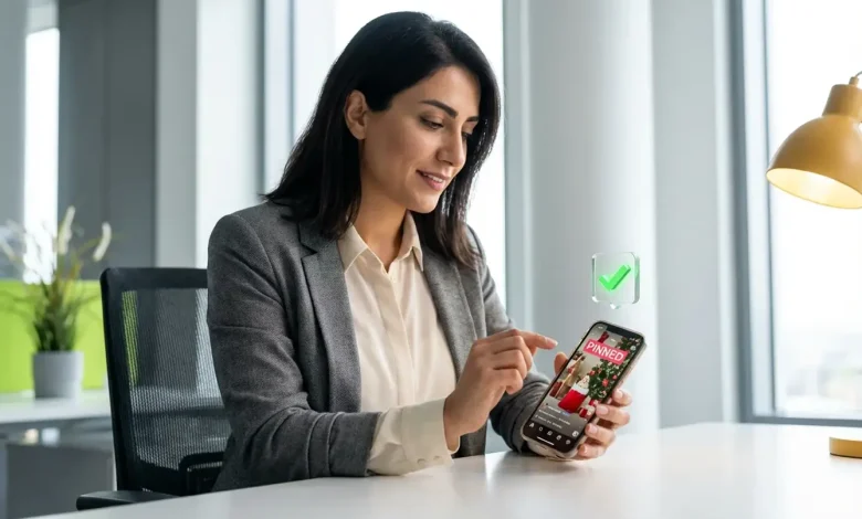 یک خانم در حال پین کردن ریلز و پست تبلیغاتی کریسمس برای افزایش فروشیک خانم در حال پین کردن ریلز و پست تبلیغاتی کریسمس برای افزایش فروش